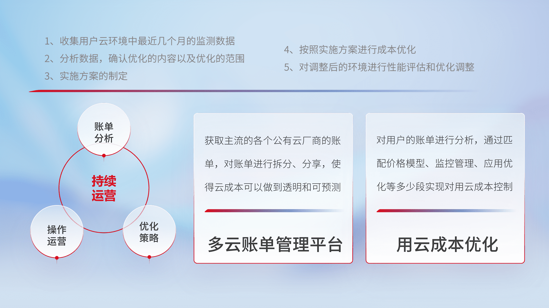 通过多云纳管,,以统一的资源数据模型把客户的云资源进行抽象和封装,,,进而实现对多云资源的统一操作,,,,保障云资源管理的可靠性、、、稳定性与可用性。。量身定制化运维内容,,,配置、、、开发运维、、、、补丁管理、、、备份、、监控、、、、认证和访问管理、、、审计和日常巡检等,,保障在用云过程中的可靠度,,,稳定度以及高可用率。。